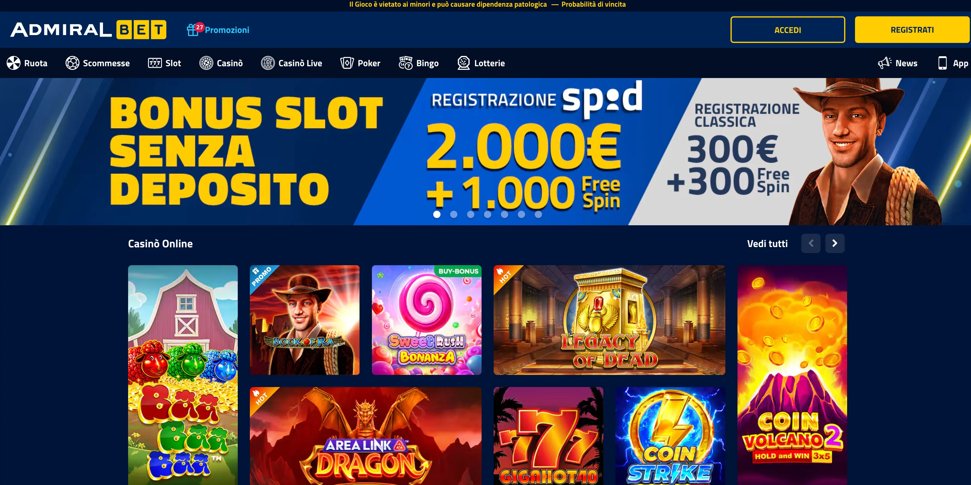 AdmiralBet rappresenta una delle realtà più consolidate nel panorama dei casinò online italiani, con una licenza che garantisce massima sicurezza e conformità alle normative nazionali. La piattaforma si distingue per un'offerta completa di slot machine, giochi da tavolo e una sezione live casino particolarmente curata, con dealer professionisti in lingua italiana.