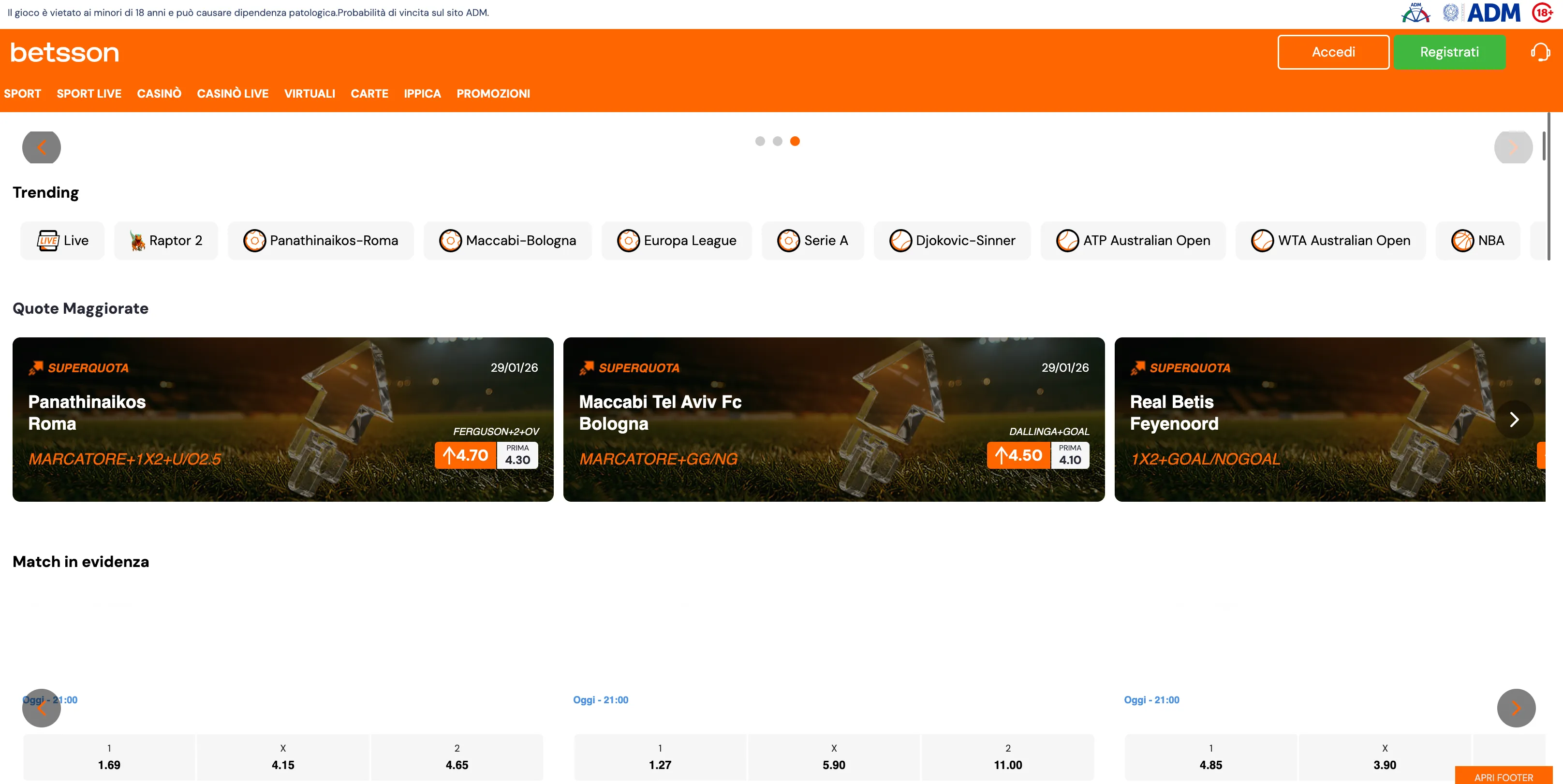 | Betsson | 100% fino a €100 | ⭐⭐⭐⭐⭐ (4.5/5) | Carte, Skrill, Neteller | Sì |