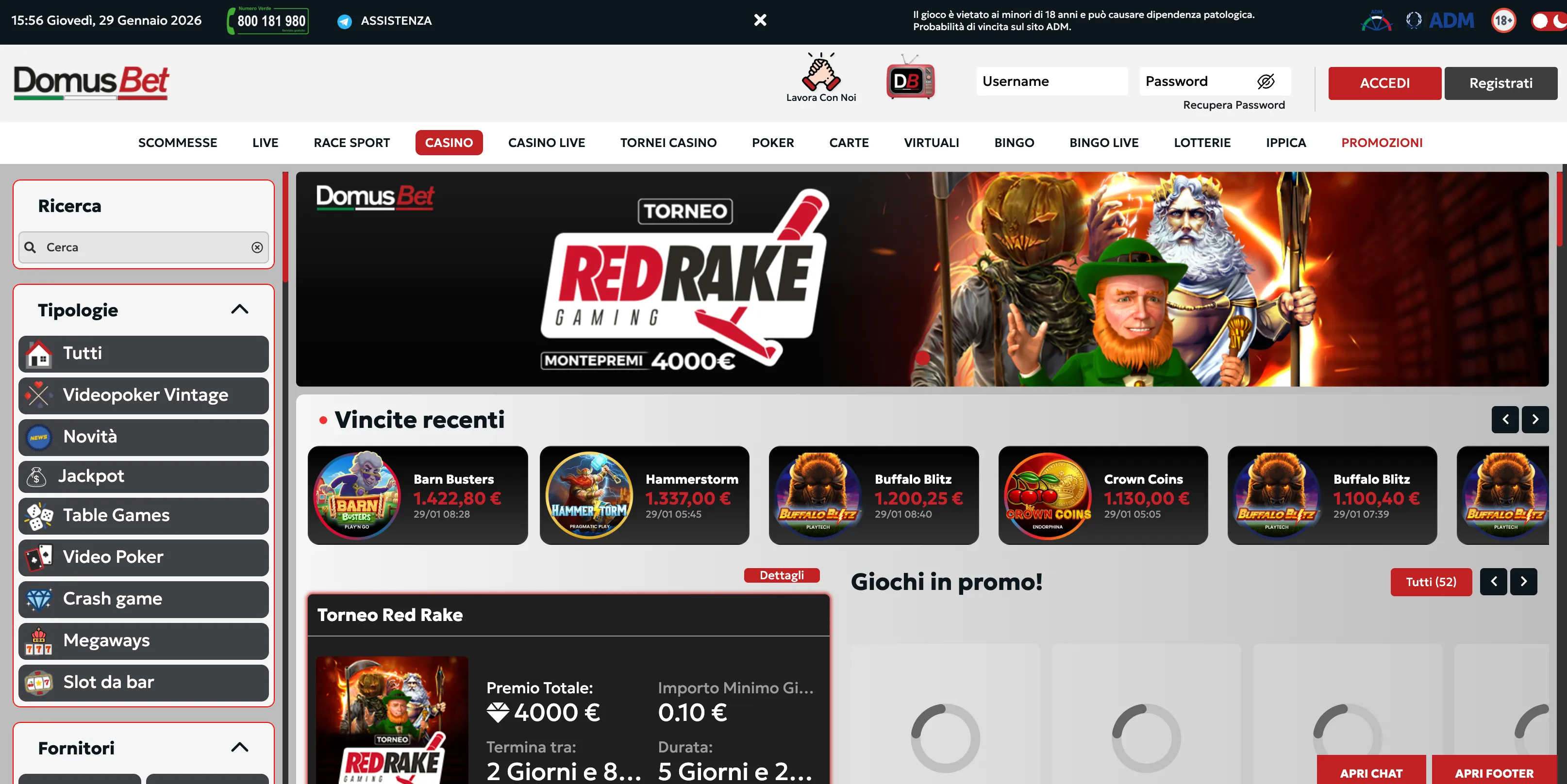| Domusbet | €500 + 200 Free Spin | ⭐⭐⭐⭐ (4.0/5) | Carte, PayPal, Bonifico | Sì |